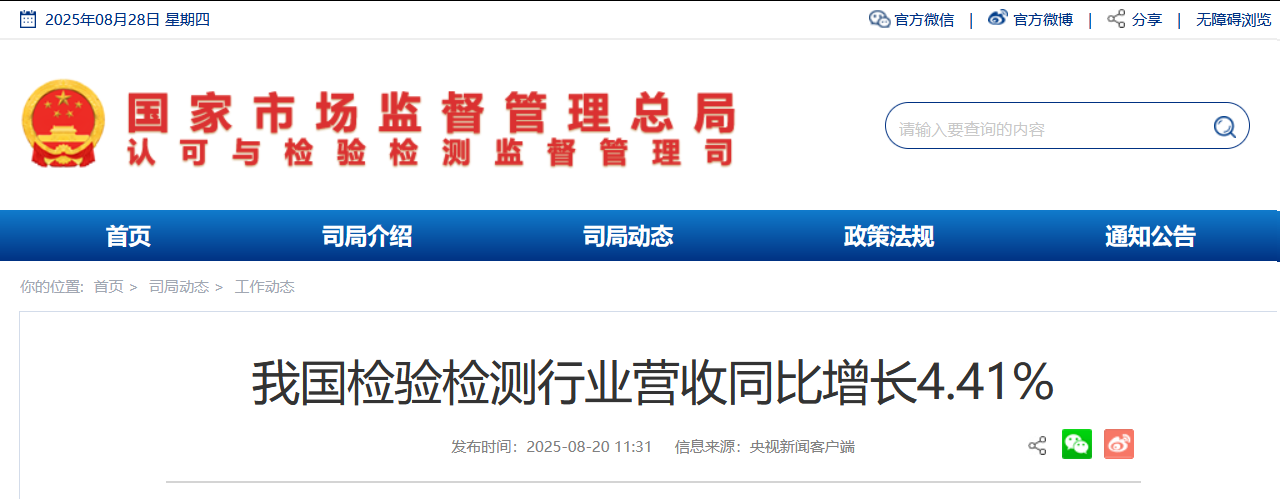 記者從市場監(jiān)管總局召開的新聞發(fā)布會(huì)上了解到,我國檢驗(yàn)檢測行業(yè)近年來發(fā)展迅速,營收穩(wěn)定增長,質(zhì)量效益穩(wěn)步提升。檢驗(yàn)檢測行業(yè)是通過專業(yè)技術(shù)手段對產(chǎn)品、材料、設(shè)備或服務(wù)等特定對象的質(zhì)量、安全、性能、環(huán)保等特性進(jìn)行檢查、測試、驗(yàn)證的現(xiàn)代服務(wù)業(yè),是國家質(zhì)量基礎(chǔ)設(shè)施的重要組成部分。2024年,全國檢驗(yàn)檢測行業(yè)共實(shí)現(xiàn)營收4875.97億元,同比增長4.41%,繼續(xù)保持良性增長勢頭,與上年比,平均每家機(jī)構(gòu)營收增加